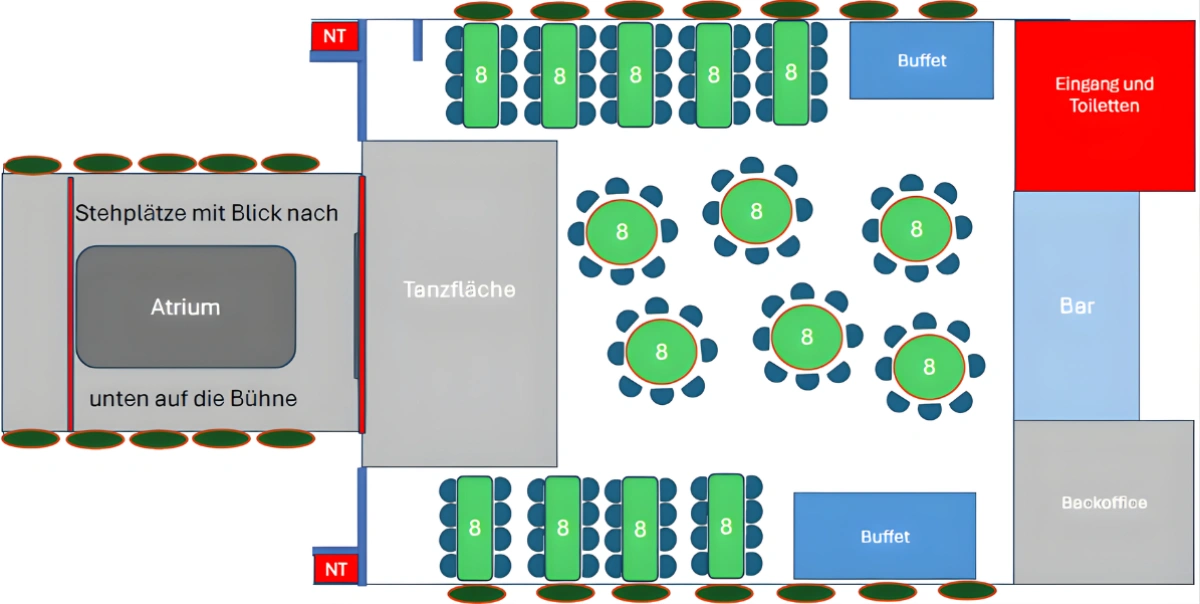 Sehen Sie sich hier den Saalplan an, um zu erfahren, wo sich Ihr Sitzplatz befindet und wo die genannten Bereiche liegen. Der Plan ist farblich nach den oben genannten Kategorien gegliedert: