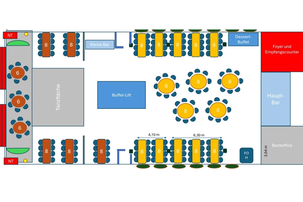 Sehen Sie sich hier den Saalplan an, um zu erfahren, wo sich Ihr Sitzplatz befindet und wo die genannten Bereiche liegen. Der Plan ist farblich nach den oben genannten Kategorien gegliedert: